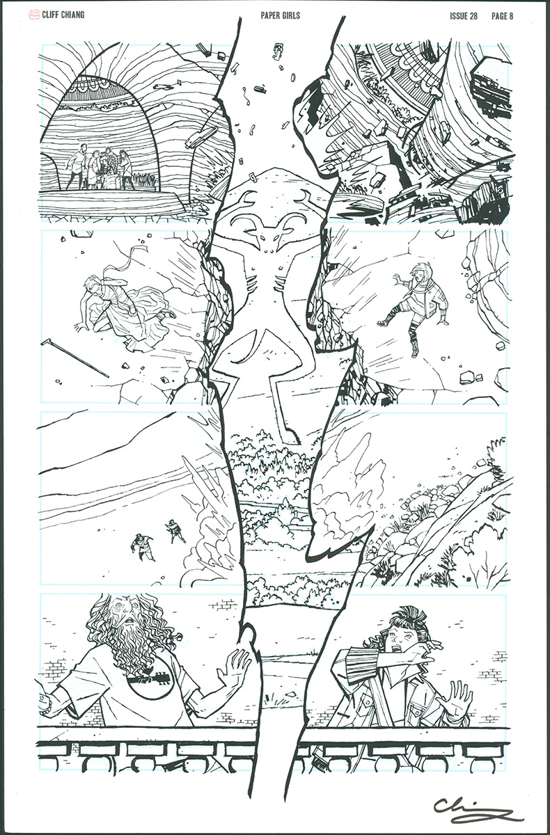 Offered here is the complete wrap-around cover and interior art (22 interior pages including 1 DPS) to Paper Girls #28 (2019) illustrated by the talented Cliff Chiang. This issue also features a unique narrative structure where each page is broken into 4-panels, and each of the 4-panels simultaneously tells the story of each of the Paper Girls (Mac, Tiffany, Tiffany, and Erin) separated across time and space as they seach for a way to reunite and save the universe! You don't have to be a semiotics and linguistics nerd to appreciate Vaughan and Chiang's narrative device: all 4 of the story's titualr characters are featured on almost every page!